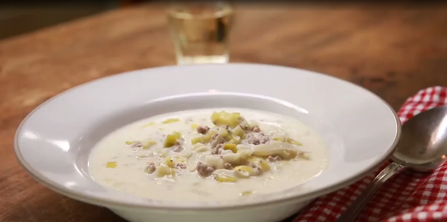 Öl in einen großen Topf geben. Das Hackfleisch darin von allen Seiten gut anbraten und mit Salz und Pfeffer würzen. Den Lauch putzen, in kleine Ringe schneiden und zum Hackfleisch geben. Ca. 5 Minuten mit anbraten, kurz vor Ende den klein gehackten oder gepressten Knoblauch dazugeben. Das Wasser zugießen, Brühwürfel hineingeben und alles ca. 10 Minuten auf kleiner Flamme köcheln lassen. Den Schmelzkäse einrühren und schmelzen lassen. Crème fraîche untermengen und noch einmal kurz aufkochen lassen. Die Suppe mit Salz, Pfeffer, Muskat, Knoblauch- und Zwiebelpulver kräftig abschmecken.
